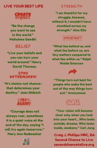 Kathryn Bumgarner BS, QP, CBIS — I wanted to take a moment to express my heartfelt gratitude for the incredible impact that Second Chance to Live has had on the brain injury community over the past 17 1/2 years. As a professional facilitating a weekly statewide brain injury virtual support group, I have witnessed firsthand the profound difference Craig’s platform has made in the lives of many survivors. One of the most remarkable aspects of Second Chance to Live is Craig’s thoughtful use of impactful quotes to inspire and motivate survivors of brain injury and other groups. These quotes often serve as powerful reminders of resilience, hope, and the strength within each individual. They spark meaningful discussions and provide a source of comfort and encouragement for those navigating the challenges of brain injury. The feedback I have received from group members consistently highlights the benefit of these quotes. They not only resonate deeply with individuals but also foster a sense of connection and shared understanding within the community. Craig’s ability to select and share quotes that speak to the heart of our experiences has been instrumental in creating a supportive and empowering environment. Thank you, Craig, for creating such a transformative platform and for being a guiding light for so many. I am honored to be a part of the Second Chance to Live community. — Warm regards, Kathryn