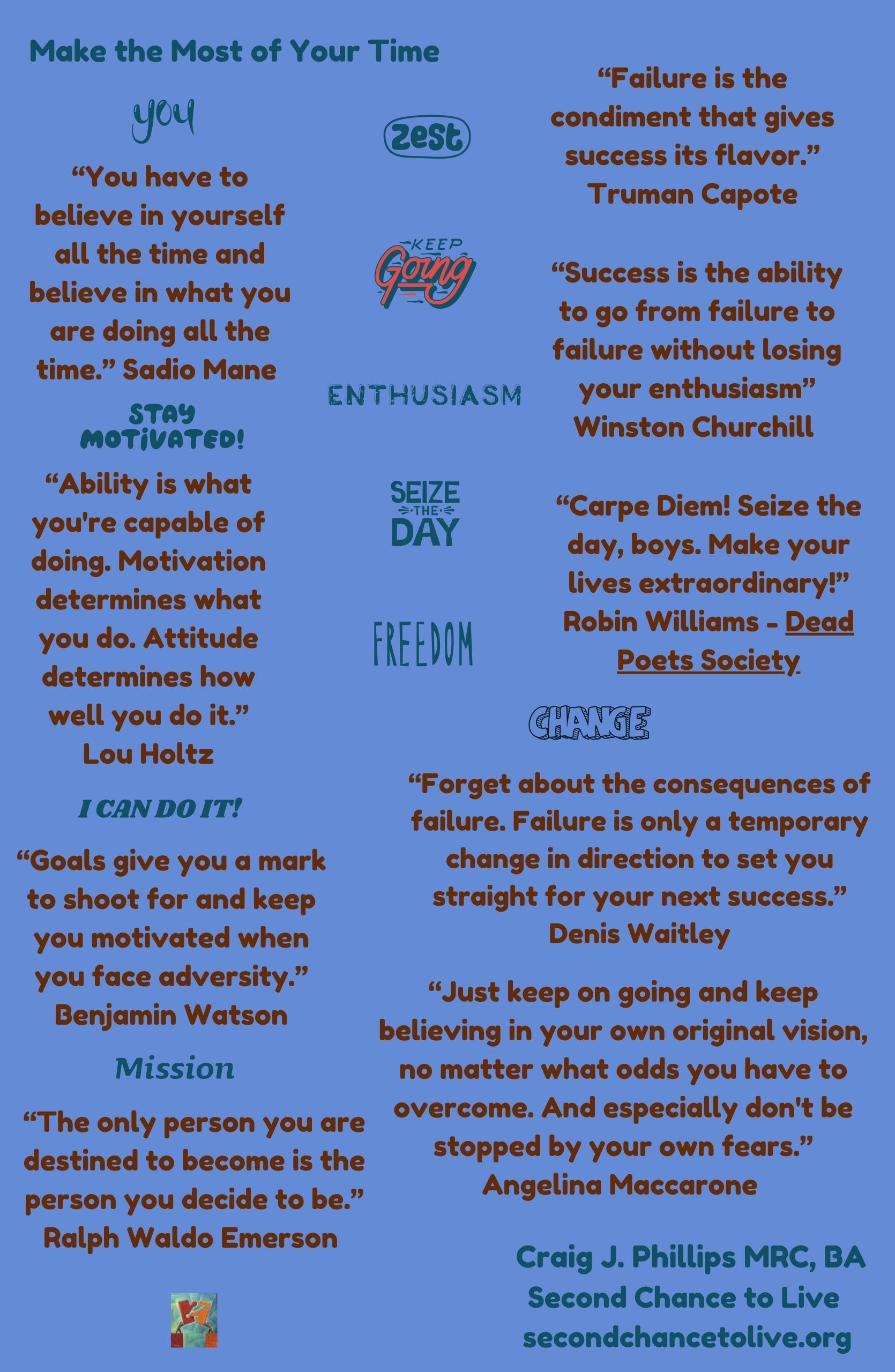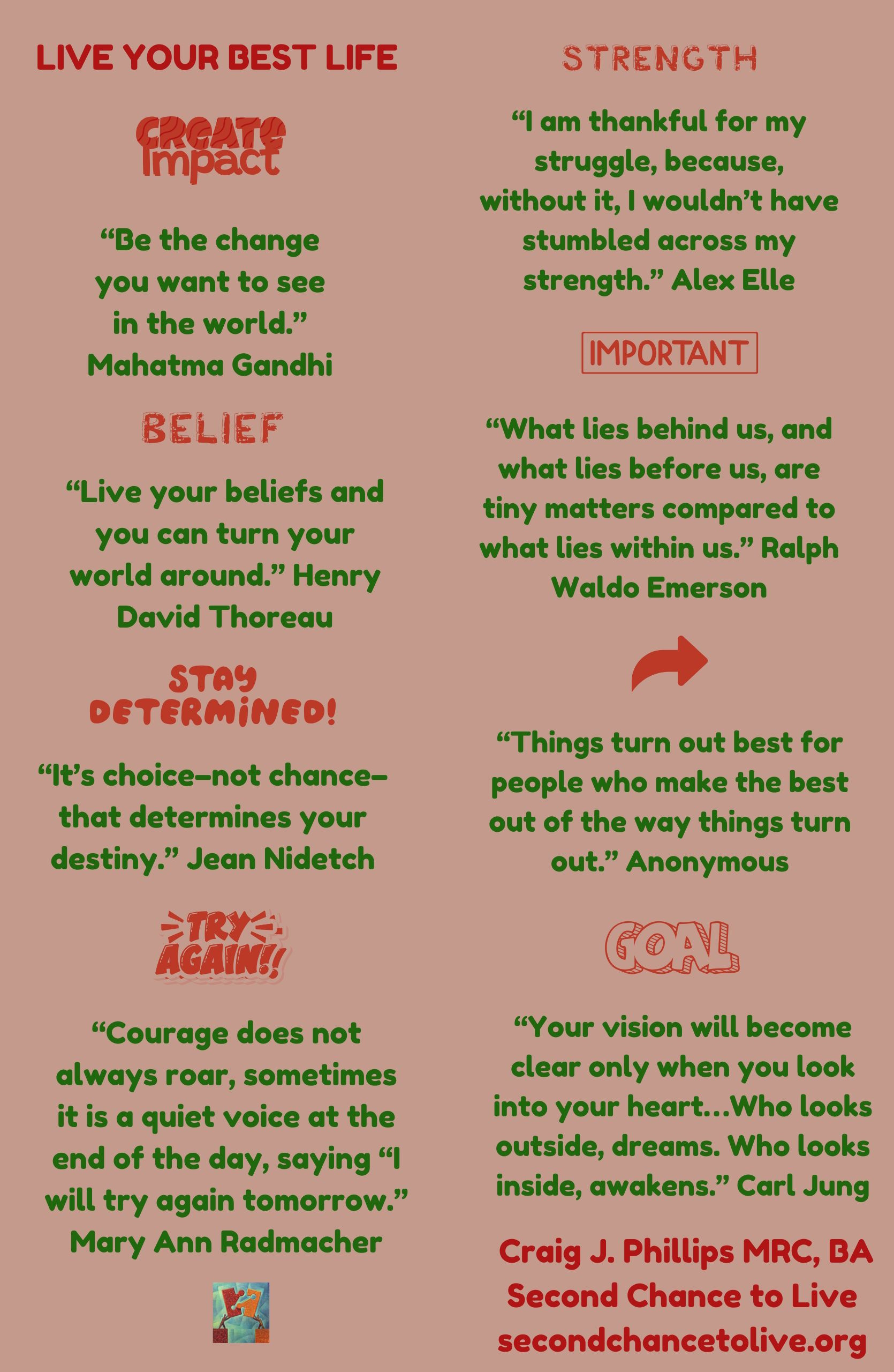 Kathryn Bumgarner BS, QP, CBIS — I wanted to take a moment to express my heartfelt gratitude for the incredible impact that Second Chance to Live has had on the brain injury community over the past 17 1/2 years. As a professional facilitating a weekly statewide brain injury virtual support group, I have witnessed firsthand the profound difference Craig’s platform has made in the lives of many survivors. One of the most remarkable aspects of Second Chance to Live is Craig’s thoughtful use of impactful quotes to inspire and motivate survivors of brain injury and other groups. These quotes often serve as powerful reminders of resilience, hope, and the strength within each individual. They spark meaningful discussions and provide a source of comfort and encouragement for those navigating the challenges of brain injury. The feedback I have received from group members consistently highlights the benefit of these quotes. They not only resonate deeply with individuals but also foster a sense of connection and shared understanding within the community. Craig’s ability to select and share quotes that speak to the heart of our experiences has been instrumental in creating a supportive and empowering environment. Thank you, Craig, for creating such a transformative platform and for being a guiding light for so many. I am honored to be a part of the Second Chance to Live community. — Warm regards, Kathryn